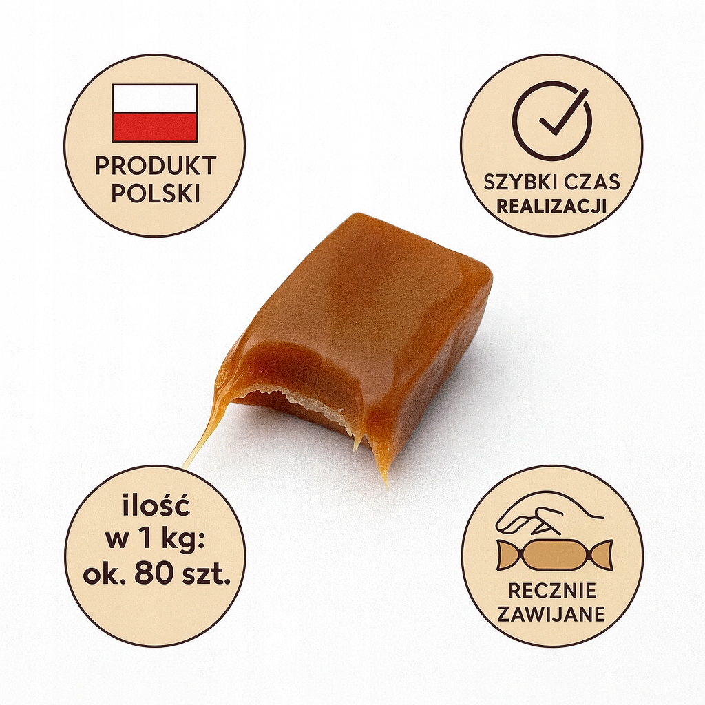 - krówki zapakowane w przezroczystą torebkę i spięte kraftową przywieszką