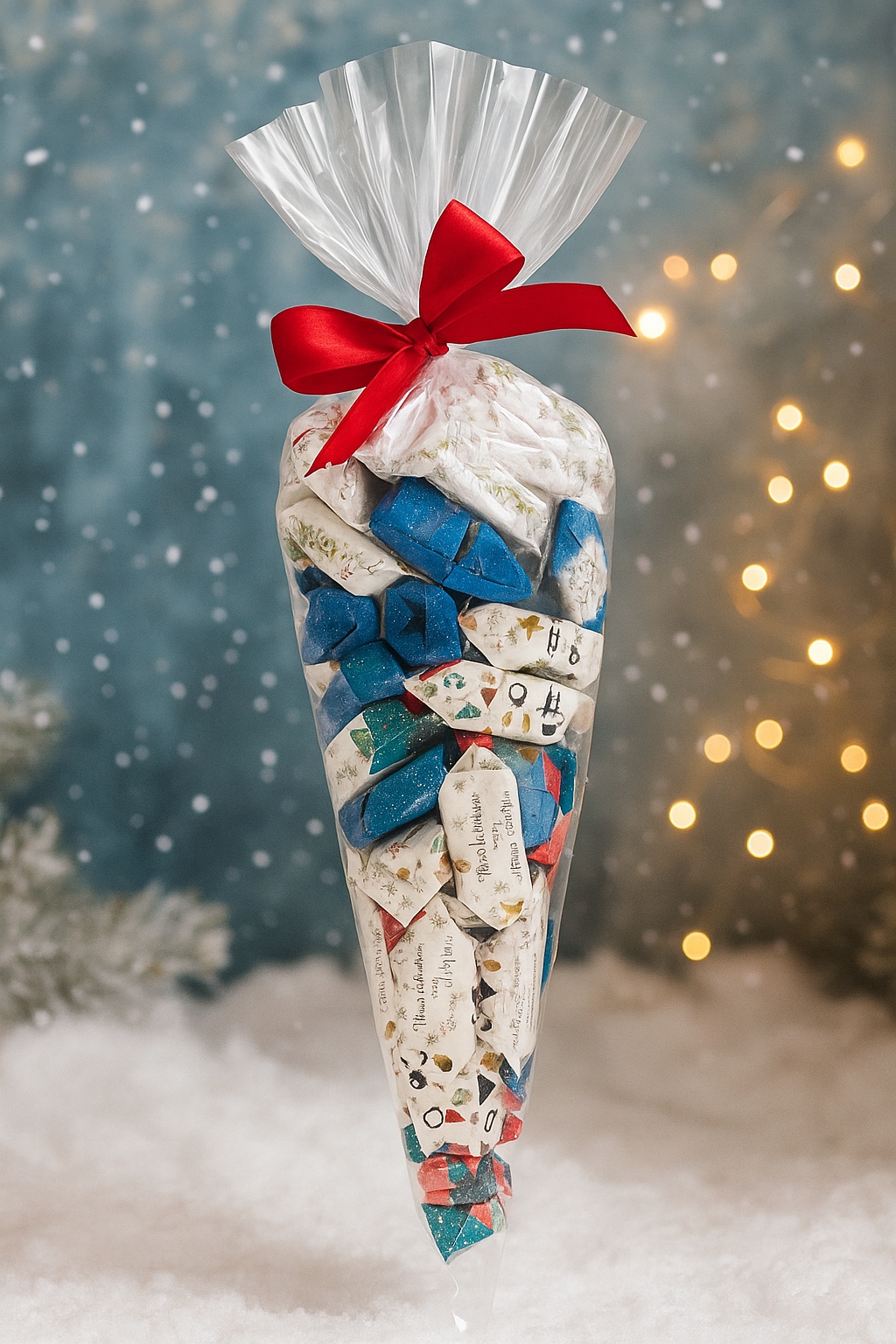 • zapakowane w przezroczysty rożek celofanowy, przewiązany czerwoną satynową wstążką