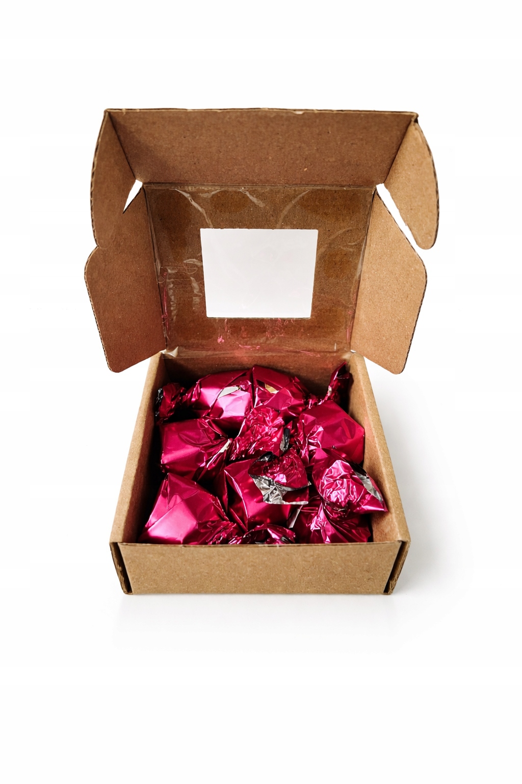• brązowe pudełko z wysztancowanym okienkiem